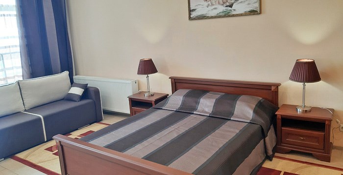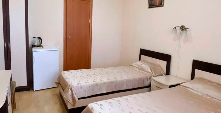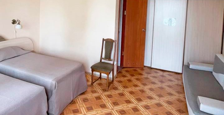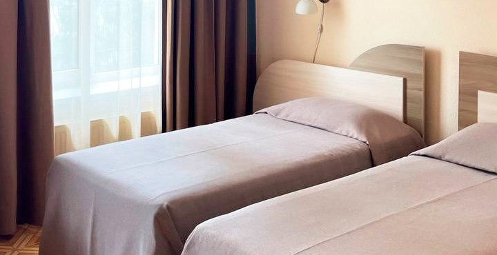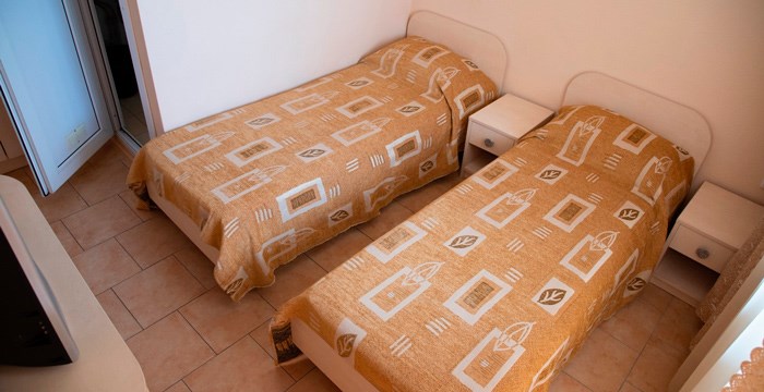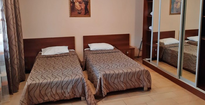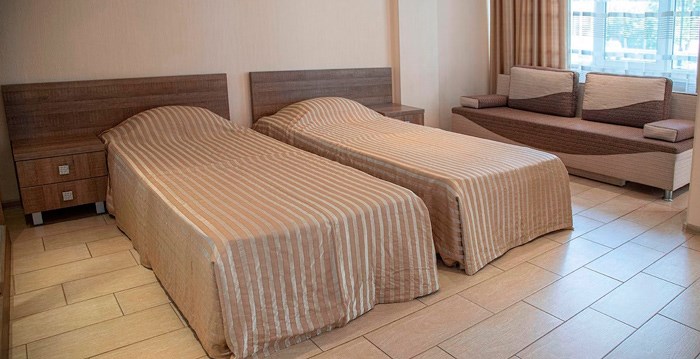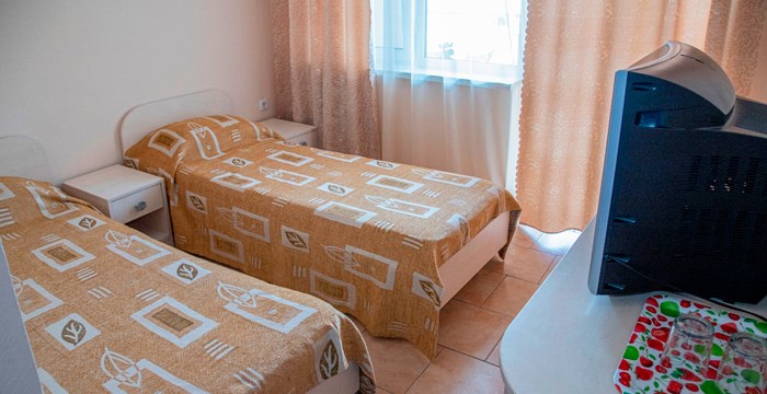 У 2-х кімнатних номерах (площа 11+11 кв.м, 3 поверх) двоспальні ліжка, розкладний диван - розміщення 3-4-х осіб.