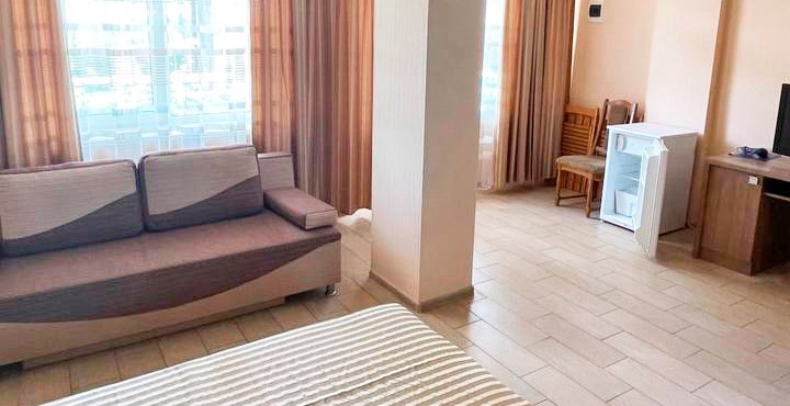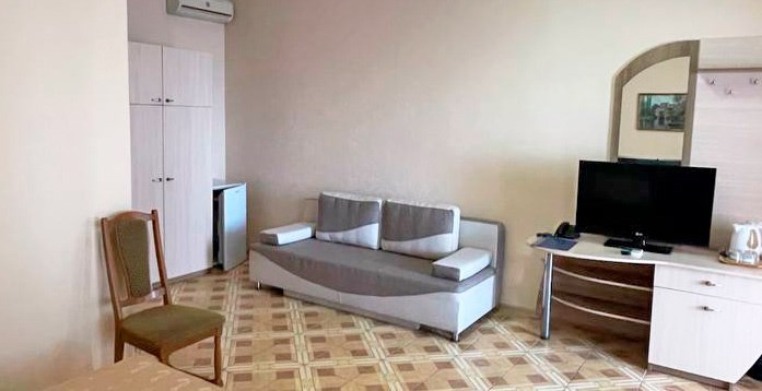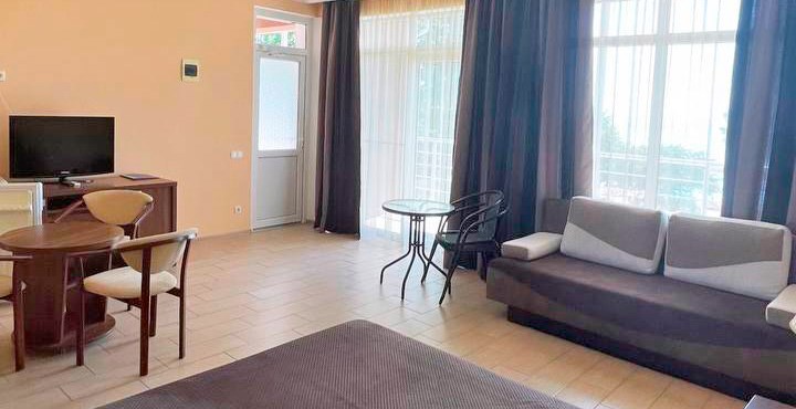 У номері: двоспальне ліжко, розкладний диван-ліжко, нові меблі, холодильник, кондиціонер, телевізор (кабельне ТБ), душ, туалет, умивальник, персональний балкон з літніми меблями, міні-сейф, фен. Площа номеру - 30 кв.м. Можливе розміщення до 4 осіб, дод. місце – диван.