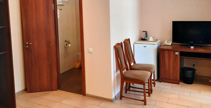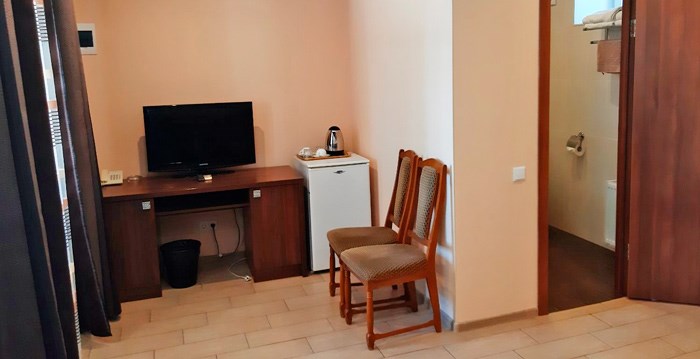 У 1 кімнатному номері: роздільні ліжка, шафа, стіл, холодильник, телевізор (кабельне ТБ), душ, туалет, умивальник, кондиціонер. Площа номеру – 11 кв.м. Номери розташовані на 1 та 2 поверсі.