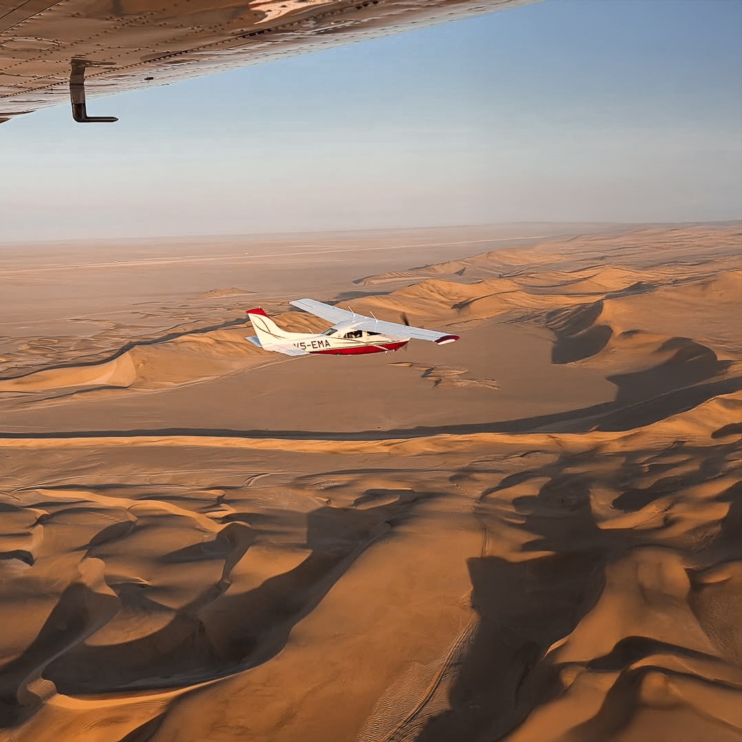 З бажаючими на маленькі літаках влітаємо низько над дюнами і відкриваємо інший вимір Намібії: безкінечні бархани, місце зустрічі пустелі з океаном і ландшафти, що з висоти виглядають мов інша планета.