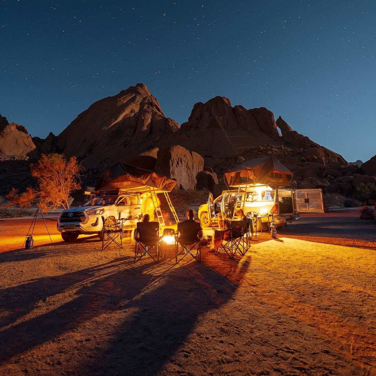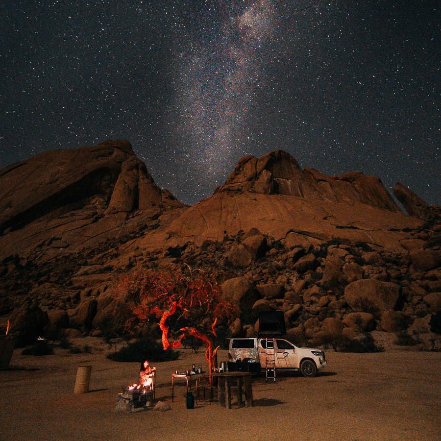 - Одна ніч у наметах на дахах авто під мільйонами зірок. Spitzkoppe — місце, яке забути неможливо. Вечір у скелях, барбекю, абсолютна тиша пустелі, і зоряне небо південної півкулі, яке здається нереальним. Це не «кемпінг».Це — один із тих вечорів, які люди згадують роками.